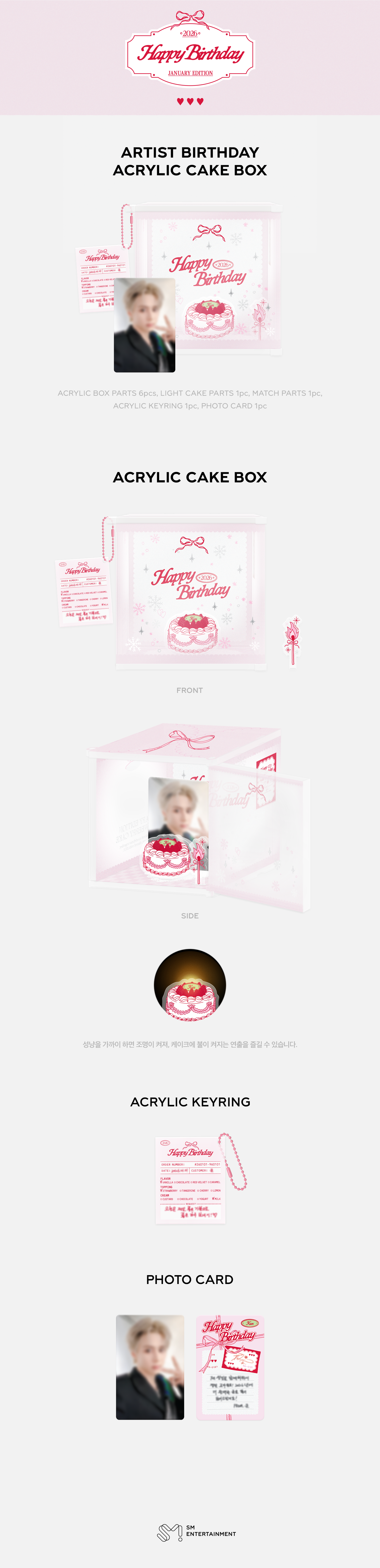 - 사이즈(mm) : 아크릴 박스 127 X 93 X 116, 케이크 조명 파츠 43 X 43 내외, 성냥 파츠 15 X 53 내외, 아크릴 키링 50 X 50 내외, 페트 45 X 60, 포토카드 55 X 85