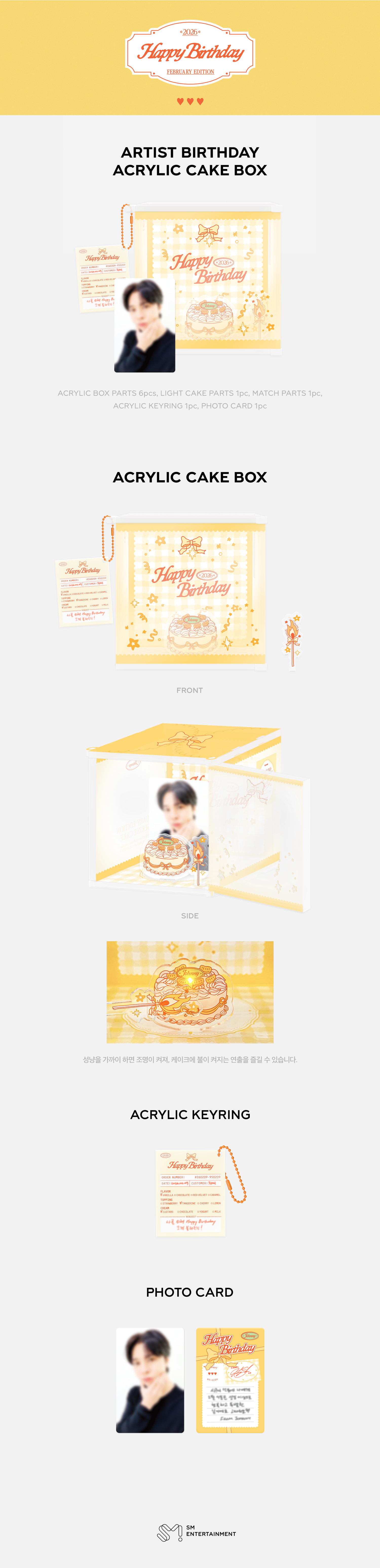 - 상품 : ACRYLIC CAKE BOX (아크릴 박스 6pcs, 케이크 조명 파츠 1pc, 성냥 파츠 1pc, 아크릴 키링 1pc, 포토카드 1pc)