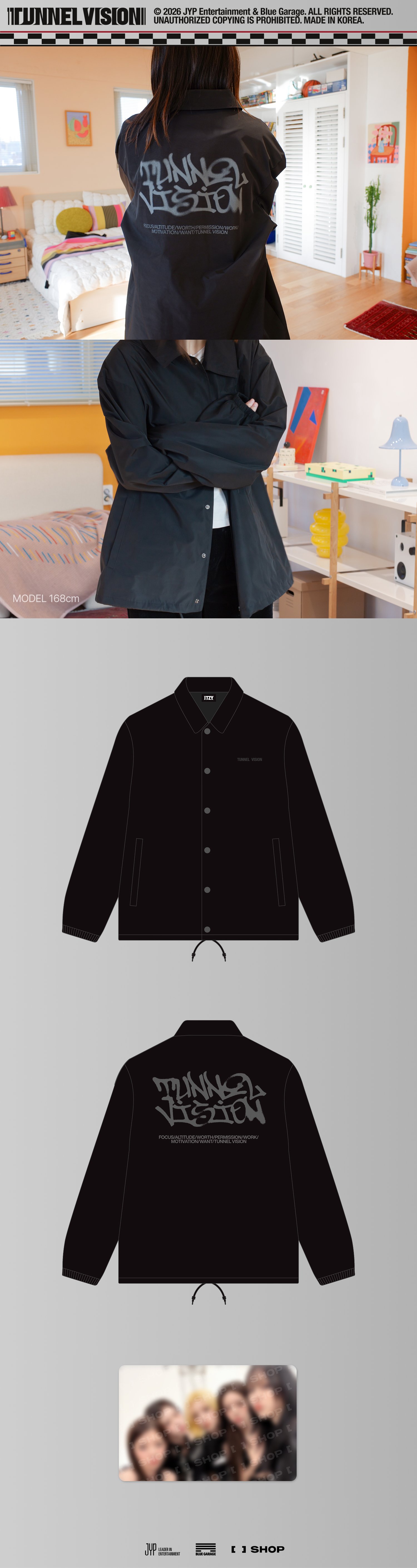 사이즈 : JACKET - FREE : 어깨 단면 56CM, 가슴 단면 63CM, 소매 65CM, 총 기장 78CM / PHOTOCARD - 8.5X5.5CM