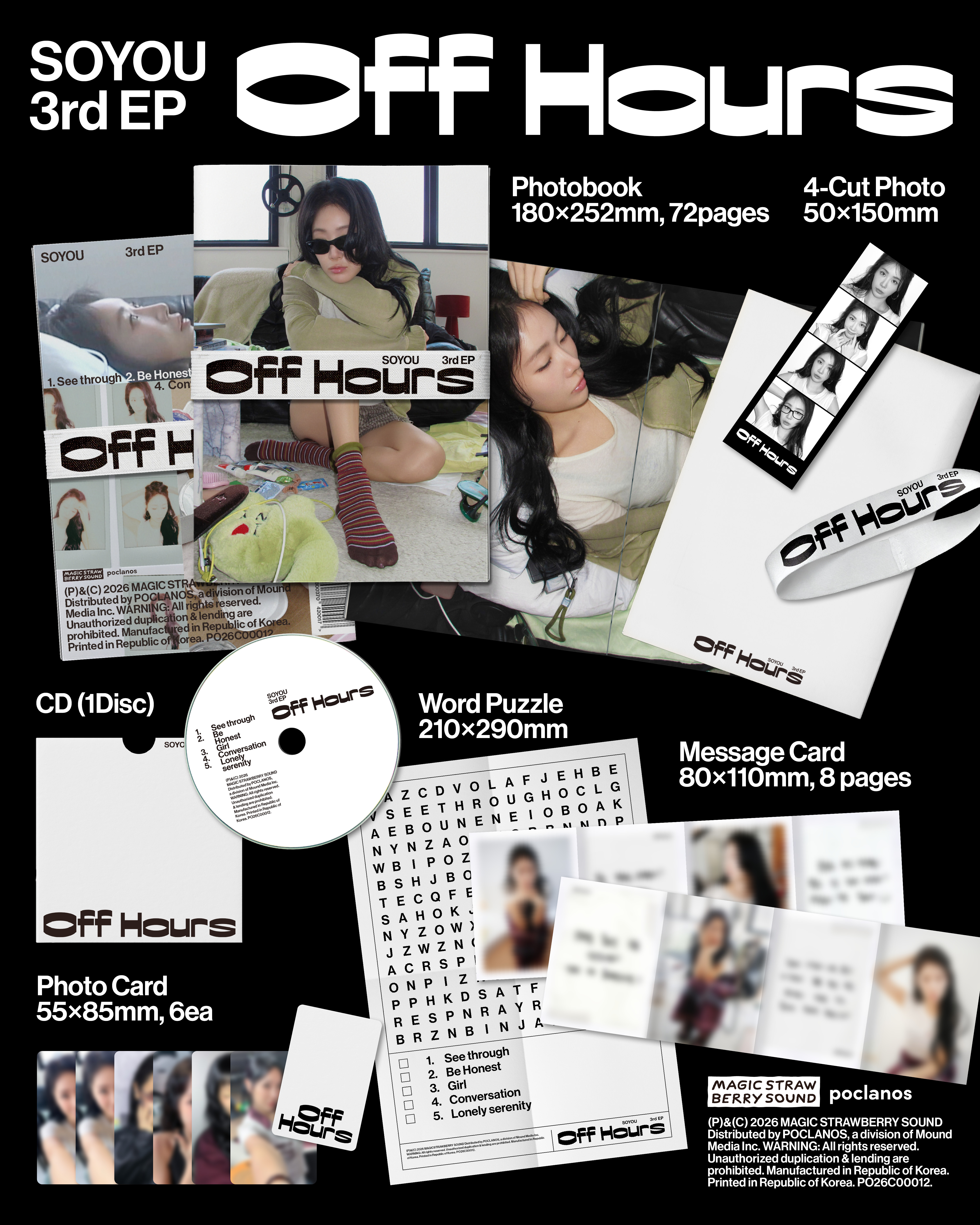 소유의 세 번째 EP [Off Hours]는 혼자만의 시간 속에서 마주하는 감정의 단면을 포착한다. 이번 앨범에서 소유는 본능적인 이끌림부터 억눌린 감정의 폭발, 숨기고 싶은 내면의 모습 등 다양한 감정의 조각들을 5개의 트랙에 담아내며 자기 내면을 오롯이 바라보는 순간을 그려낸다. 직접 작사에 참여한 소유는 ‘진정한 나’를 찾아가는 과정을 앨범 속에 고스란히 녹여냈다. 하루의 끝에 찾아오는 고요함처럼, 이 앨범은 복잡한 일상을 지나 스스로를 마주하는 ‘Off Hours’의 시간을 완성한다.