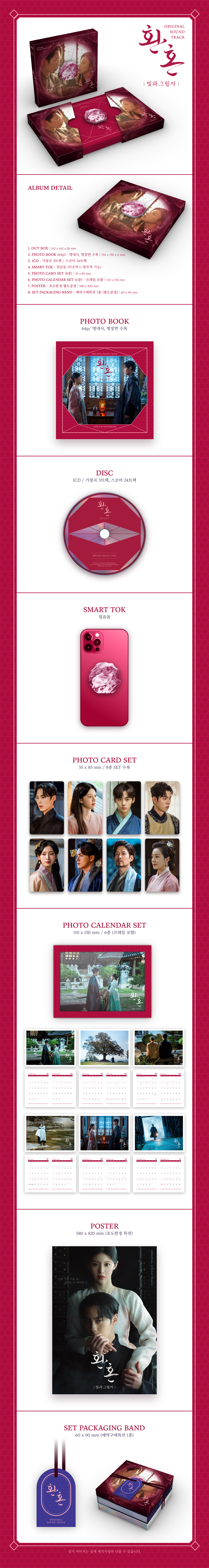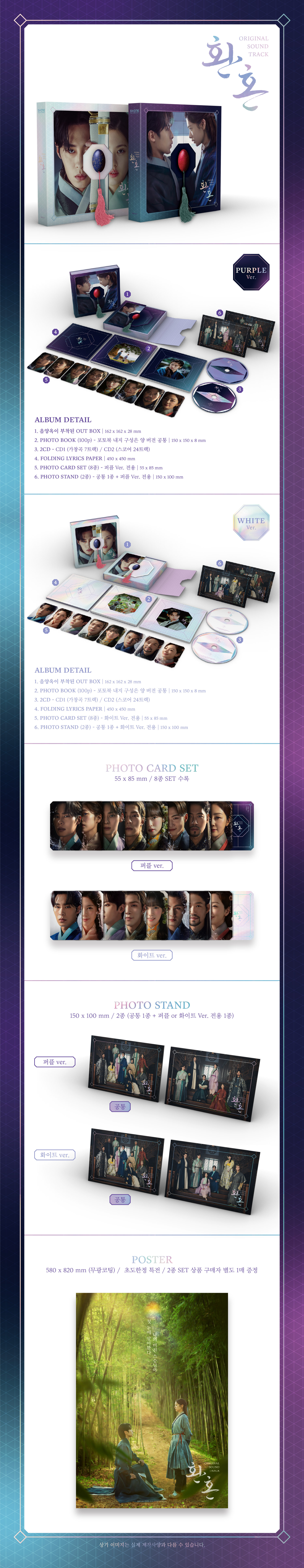 '환혼'의 OST 음반 역시 가창곡 7곡에 더해 드라마 명장면과 함께 어우러진 스코어 24곡까지 총 31트랙으로 구성되며 드라마 속 중요한 소품 중 하나인 음양옥을 음반 패키지에 구현해 '환혼'만의 유니크한 느낌으로 소장 가치를 높였고, 드라마 명장면과 대사가 수록된 100페이지 분량의 포토북은 물론, 팬들의 취향을 고려한 퍼플 버전과 화이트 버전 총 2종의 구성과 함께 각 버전의 컬러 요소를 반영한 포토카드와 포토 스탠드 부록에도 차별화를 두어 음반의 다채로움을 더하여 종영을 아쉬워하는 팬들에게 깊은 감동과 진한 여운을 선사할 것으로 기대된다.