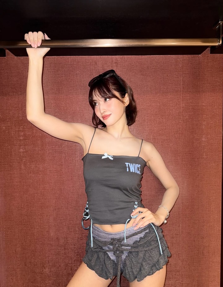 In the posted photos, Momo flaunted her stunning appeal by pairing black ultra-mini shorts with a slim sleeveless top, presenting a bold yet sophisticated look.