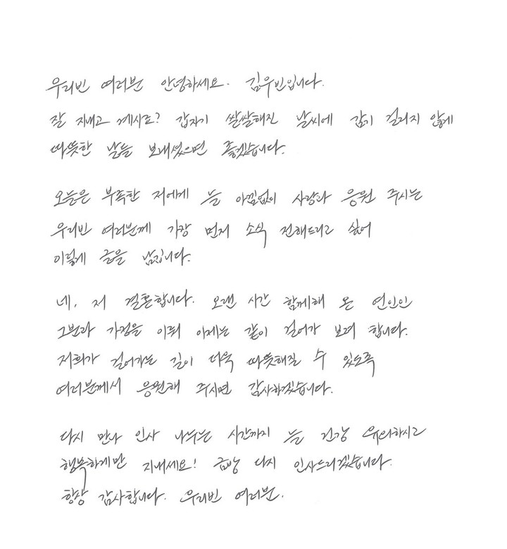 さらに、「またお会いしてご挨拶するその時まで、いつも健康に気をつけて、幸せに過ごしてください。すぐにまたご挨拶します。いつも感謝しています、ウリビンの皆さん」と手紙を締めくくった。